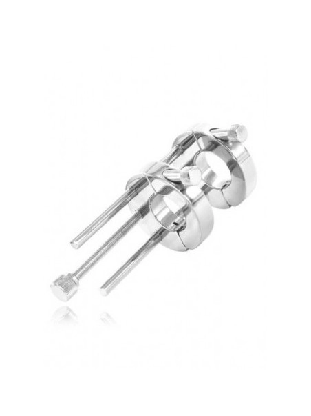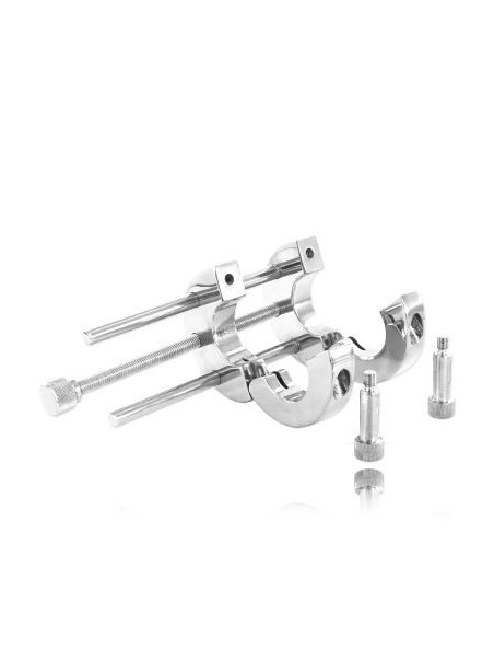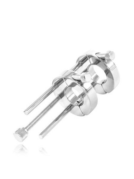 L’accessoire indispensable pour u00e9tirer les couilles ! Dans un acier inoxydable, cet u00e9tireur dispose de deux ballstretchers d’un diamu00e8tre de 30mm qui se referment avec une vis. L’ensemble est montu00e9 sur une longue vis de sorte que la su00e9paration entre les deux ballstretchers soit tru00e8s progressive. Idu00e9al pour jouer en solo ou u00e0 deux!