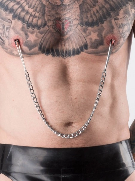 Pinces style pince u00e0 u00e9piler et chau00eene en mu00e9tal chromu00e9. Embouts en caoutchouc amovible. En faisant coulisser l’anneau on augmente la pression.