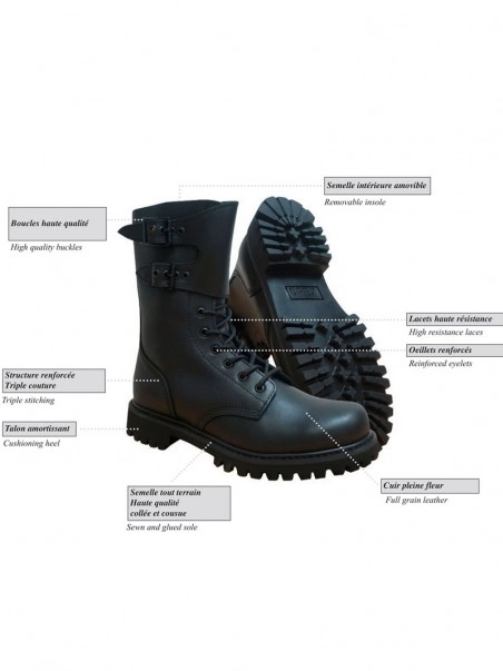 u00c9lu00e9ments indispensables du vestiaire fetish, nos rangers en cuir souple, type armu00e9e franu00e7aise, on des semelles crantu00e9es en caoutchouc ru00e9sistant.