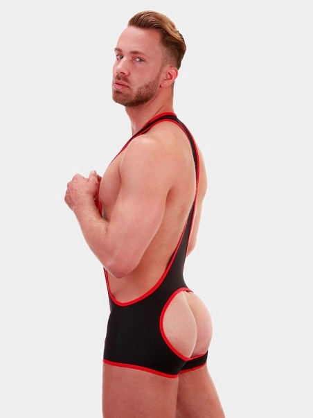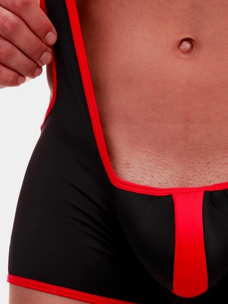 La coupe elle, est très échancrée et très sexy. Côté face les longues bretelles affinent la silhouette et plonge dans un shorty minimaliste assorti d’une poche confortable à effet gros paquet. Côté pile, le body très échancré laisse une large part de visibilité aux dorsaux, et c’est tant mieux, et se complète par une belle ouverture pour les fessiers.