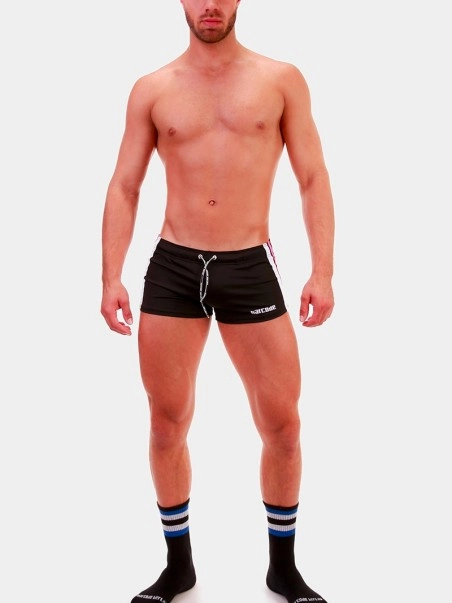 Notre mini short Timur de la marque allemande BarcodeBerlin fleure bon la saison estivale, et ses périodes de chaleurs intenses. La coupe taille basse et très prés du corps en font évidemment un short ultra-sexy. Le design aux bandes latérales de couleurs coordonnées à la couleur dominante, ajoute une note sportive au short.