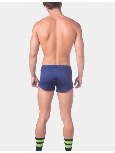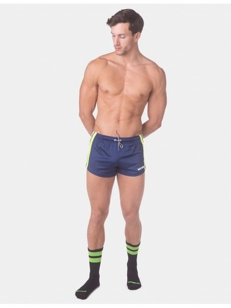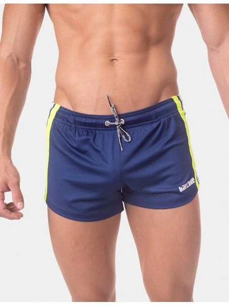 Notre mini short Timur de la marque allemande BarcodeBerlin fleure bon la saison estivale, et ses pu00e9riodes de chaleurs intenses. La coupe taille basse et tru00e8s pru00e9s du corps en font u00e9videmment un short ultra-sexy. Le design aux bandes latu00e9rales de couleurs coordonnu00e9es u00e0 la couleur dominante, ajoute une note sportive au short.
