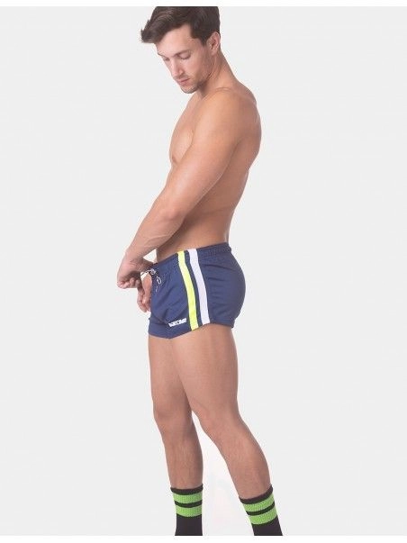 Notre mini short Timur de la marque allemande BarcodeBerlin fleure bon la saison estivale, et ses périodes de chaleurs intenses. La coupe taille basse et très prés du corps en font évidemment un short ultra-sexy. Le design aux bandes latérales de couleurs coordonnées à la couleur dominante, ajoute une note sportive au short.