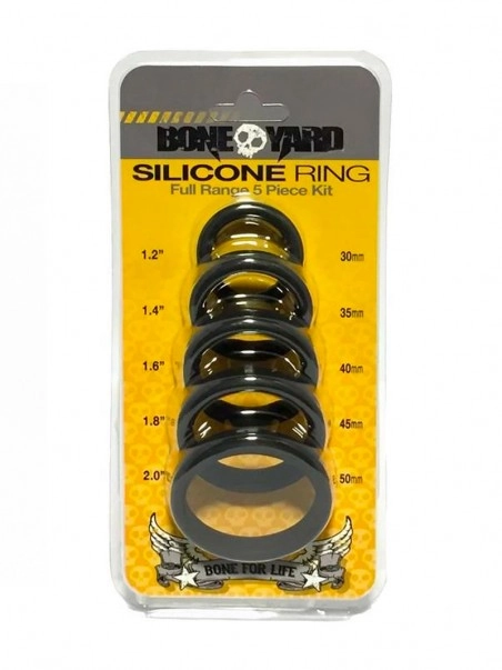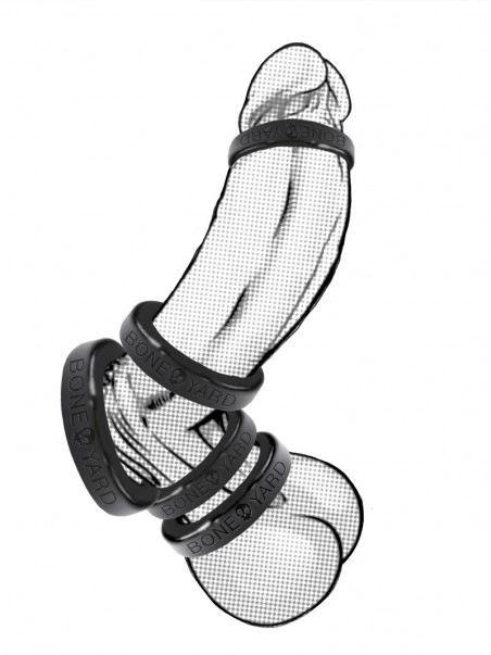 Ce lot de 5 cockrings au diamu00e8tre diffu00e9rent vous offre de multiples possibilitu00e9s de jeux. Vous avez le choix de l’usage : cockring, anneau de gland, ballstretcher… ou tout u00e0 la fois. Les cockrings BoneYard sont extensibles et offrent un confort optimal.