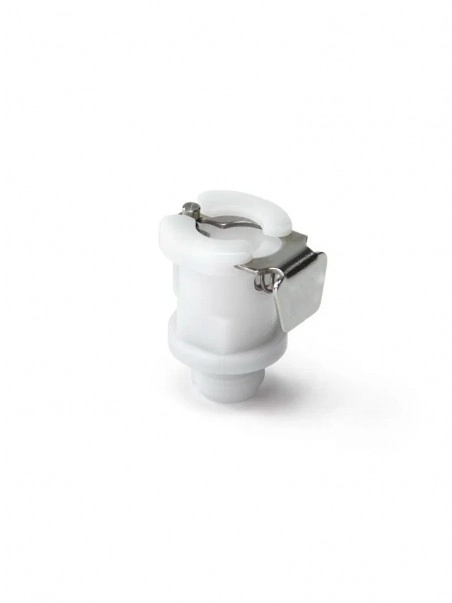 Connecteur de rechange. La partie haute est pru00e9vue pour clipser l’adaptateur reliu00e9 au tuyau. La partie basse est filetu00e9e et se visse sur un de nos cylindres u00e0 pu00e9nis.