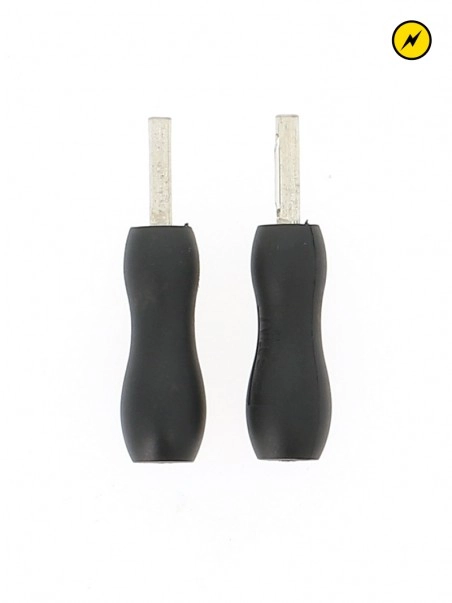 Une paire d’adaptateurs moulés sur mesure permettant de connecter une fiche banane TENS de 2 mm à l’un de nos électrodes équipés de connecteurs 4 mm.