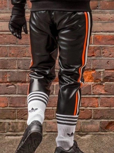 Notre pantalon de sport nouvelle génération qui crée un look fétiche et sportif. Fait dans un simili cuir de qualité, avec des finitions soignées, notre jogging fetish Mr Riegillio offre un confort agréable, et un entretien facile. C’est un bas de sur-vêtement taille basse aux rayures latérales, équipé d’un cordon de serrage à la taille et de poches sur le devant.