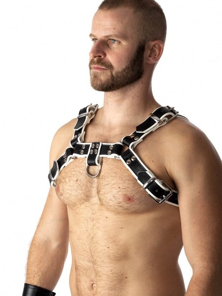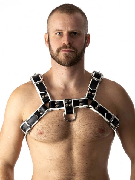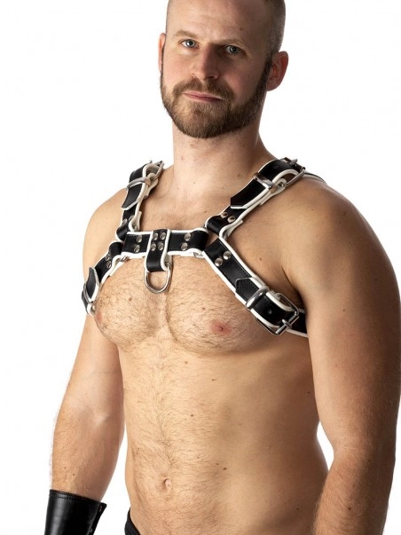 Du00e9clinaison de notre cu00e9lu00e8bre harnais Pitbull en cuir noir souple, ce harnais de poitrine est composu00e9 d’une laniu00e8re en cuir blanche, doublu00e9e d’une laniu00e8reu00a0enu00a0cuir noir lu00e9gu00e8rementu00a0plus u00e9troite. Les deux u00e9lu00e9ments sont cousus et l’ensemble est rivetu00e9.u00a0