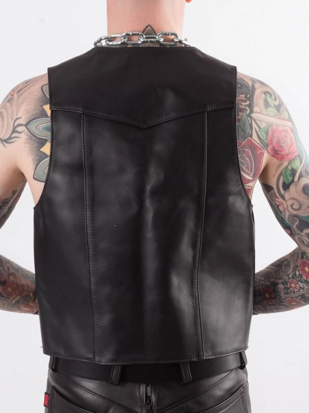 Notre gilet en cuir classique, toujours confectionnu00e9 dans un cuir souple de qualitu00e9. Le gilet recouvre juste ce qu’il faut les tu00e9tons, tout en laissant une belle ouverture pour laisser entrevoir le buste. Le gilet est fait dans un cuir souple et ru00e9sistant. La veste en cuir se porte indiffu00e9remment u00e0 mu00eame la peau, sur un t-shirt (RoB Paris bien entendu) avec un chaps, un pantalon en cuir, un jeans…